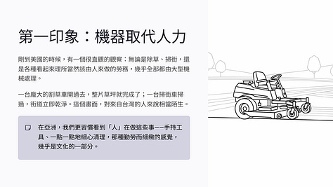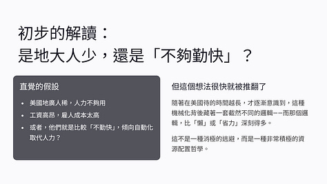 所以我一開始的解讀,其實很簡單:是不是因為美國地太大、人比較少,所以只能靠機械?或者更直白一點,是不是他們比較「不那麼勤快」,所以傾向用自動化取代人力?