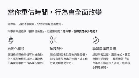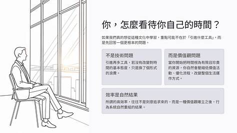 當你開始把時間視為有限且珍貴的資源,你自然會去壓縮低價值活動、優化流程,甚至改變你整個生活的運作方式。