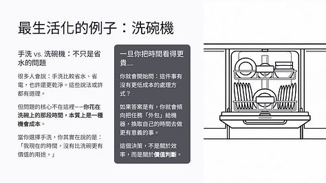 很多人會說:手洗比較省水、省電,也比較乾淨。但問題是,你花在洗碗上的那段時間,本質上是一種「機會成本」。