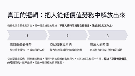從大型設備,到家用電器,再到今天的軟體、自動化流程,甚至是AI,本質上都是在做同一件事情——壓縮「必要但低價值」的時間消耗。