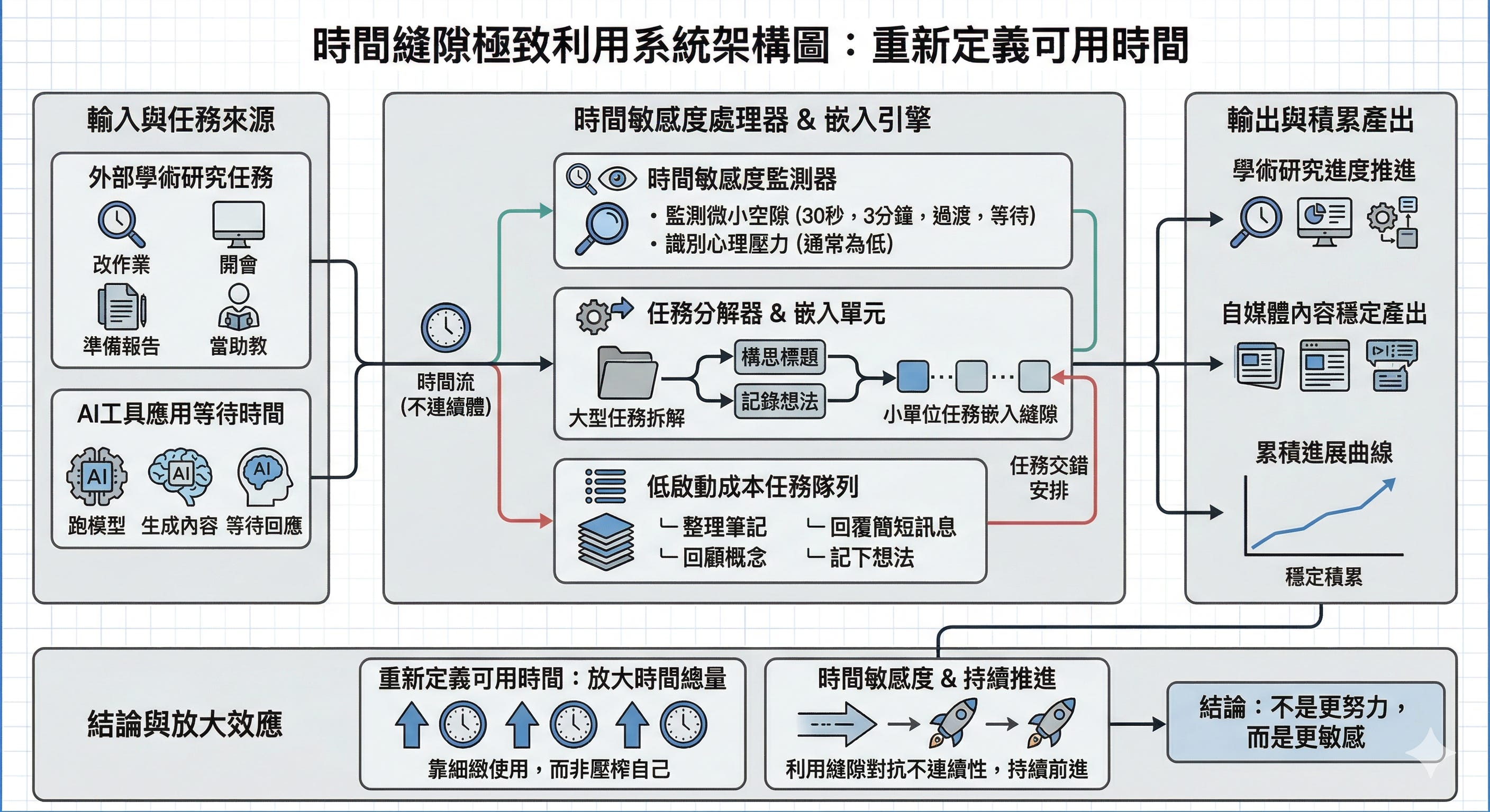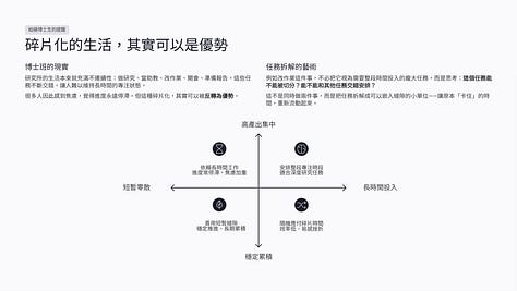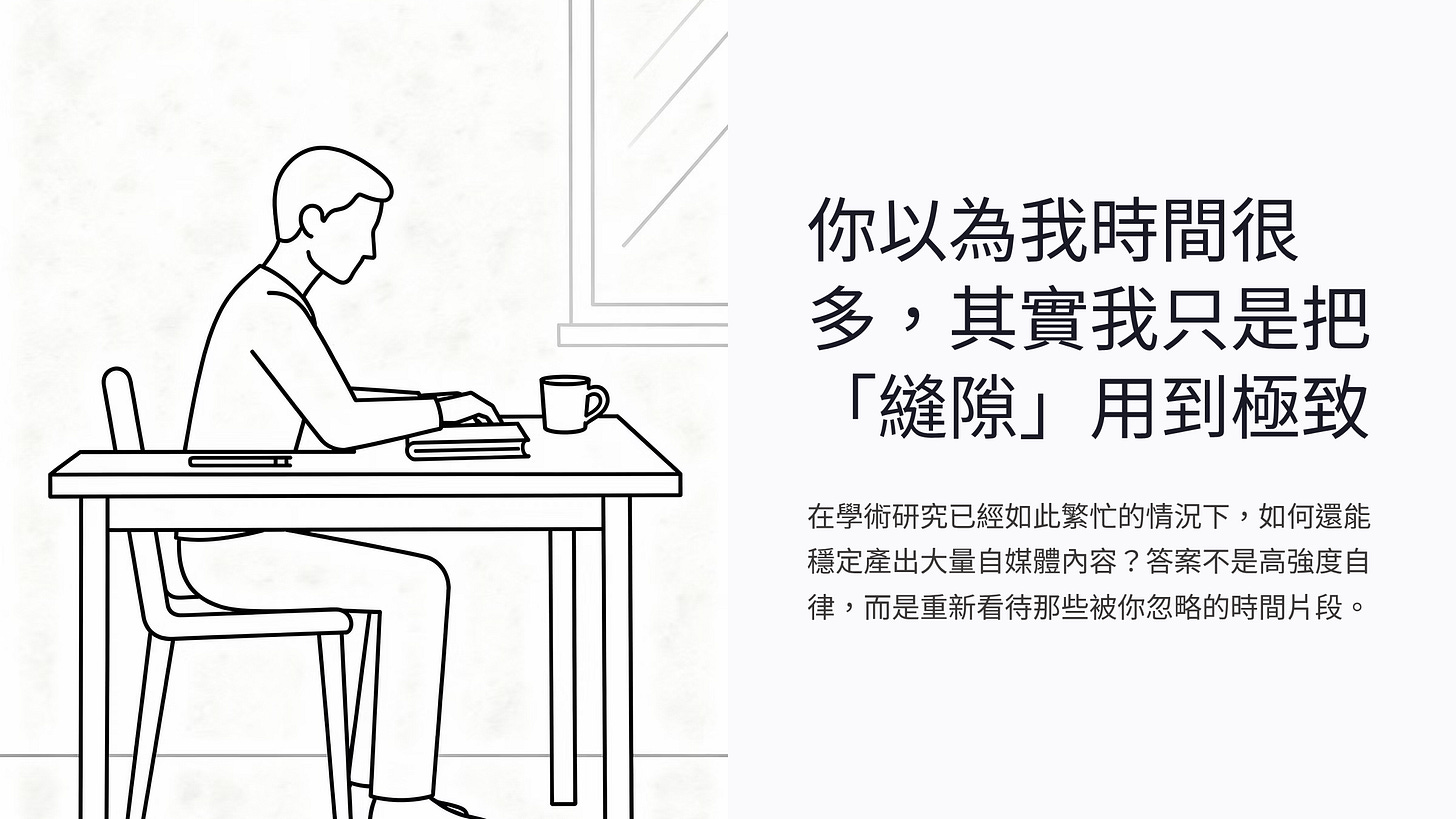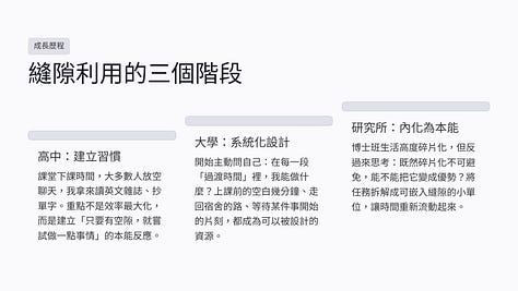 對碩博士生來說,這可能是一個很關鍵的能力。因為你的生活,本來就充滿了不連續性與不確定性。如果你只依賴大塊時間,你會很容易感到進度停滯;但如果你學會利用縫隙,你就能在看似零碎的生活中,持續推進。