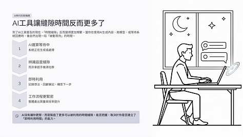 當你在使用AI生成內容、跑模型、或等待系統回應時,實際上會出現一段「被動等待」的時間。這段時間,如果你沒有意識,很容易就被滑手機或發呆填滿。