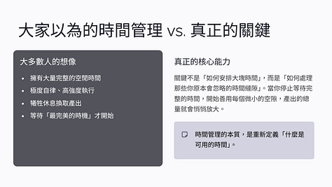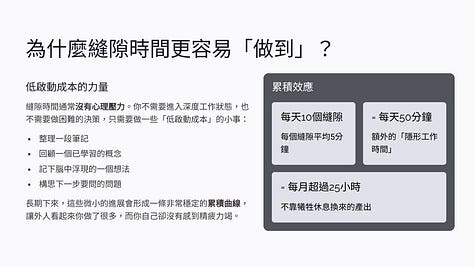 而你能不能把這些縫隙轉化成產出,取決於你有沒有建立這種「即時利用時間」的能力。