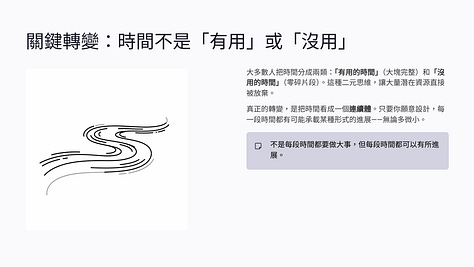 這裡有一個關鍵轉變:我不再把時間分成「有用」和「沒用」,而是把它看成一個連續體。只要你願意設計,每一段時間都有可能承載某種形式的進展。