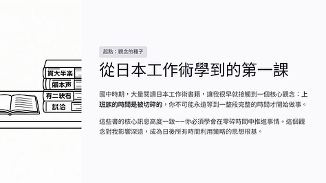 國中的時候,我讀過很多日本的工作術書籍。那些書的核心其實很一致:上班族的時間是被切碎的,你不可能永遠等到一整段完整的時間才開始做事,所以你必須學會在零碎時間中推進事情。